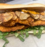 Breaded or grilled chicken breast on a long roll with grilled poblano peppers, broccoli rabe, provolone cheese & balsamic glaze on hero.