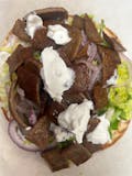 Served on a wrap. Tomatoes, pickles, onions & tahini sauce.
