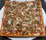 Thin crust square pizza with tomato sauce, mozzarella cheese, olive oil & garlic.
