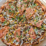Wahizza homemade chimi sauce, Angus ground beef, red onion’s, cabbage, tomatoes, cilantro , sesame seeds on a thin crust