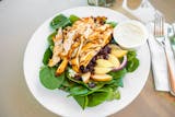 (Grilled or chicken salad) over garden salad with apples, walnuts, and raisins. Served with romaine, egg, grape tomatoes, red onions, carrots, cucumbers, olives, roasted peppers & red cabbage.