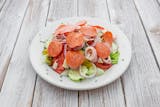 Gluten free.Iceberg lettuce, tomato, cucumber, red onion, black and green olives, roasted red peppers, pepperoncini peppers, and provolone cheese.