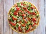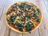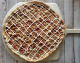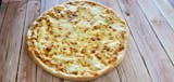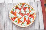 Fresh plum tomato sauce pie topped with fresh mozzarella cheese, fresh basil, and extra virgin olive oil.