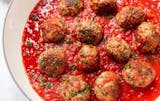 Meatballs topped with fresh tomato sauce and melted mozzarella cheese