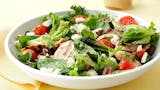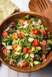 Vegetarian. Crispy romaine lettuce, tomatoes, cucumbers, and kalamata olives.
