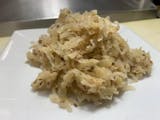 Two weisswurst, bratwurst, bauernwurst or kielbasa are grilled and served on a bed of mashed potatoes and roasted sauerkraut with brown gravy.