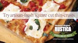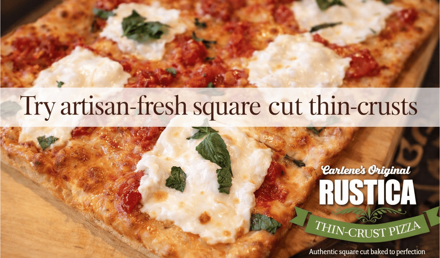 Square pizza thin crust chunky marinara sauce fresh mozzarella olive oil basil and parmesan cheese