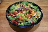 Topped with mushrooms, tomatoes, green peppers, onions, and olives.