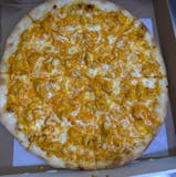 White pizza, chicken, mozzarella, buffalo sauce and side of bleu cheese.