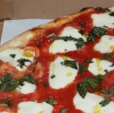 Grandma pie with fresh mozzarella, sauce, olive oil & basil.