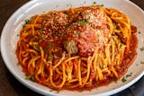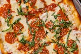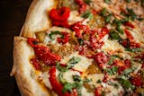 Grilled eggplant, roasted peppers, mozzarella, homemade plum tomato sauce, sprinkled with fresh basil.