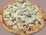 Pepperoni, sausage, green peppers, onions and mushrooms.
