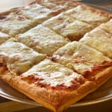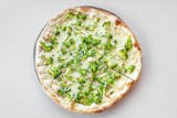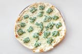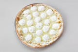 A sauceless pie topped with ricotta, mozzarella, and parmesan cheese.