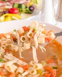 Chicken, fresh vegetables, and pasta in homemade chicken broth.