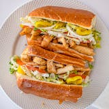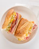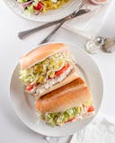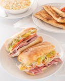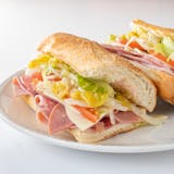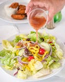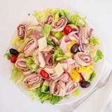 Iceberg lettuce, cherry tomato, red onion, banana peppers, cucumber, kalamata olives, artichoke, ham, salami, and provolone topped with house dressing.