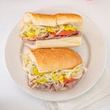 Iceberg lettuce, cherry tomato, red onion, banana peppers, cucumber, kalamata olives, ham, salami, turkey, roast beef and provolone topped with house dressing.