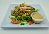 With baby arugula, fresh tomatoes, walnuts, chicken & raspberry vinaigrette dressing.