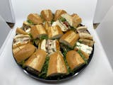 1 full tray tossed salad, large sandwich platter, 1 half tray garlic knots, 1 full tray penne vodka, 1 full tray chicken francese, 1 full tray eggplant parmesan.