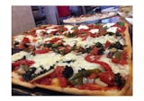 Thin & crispy traditional square brooklyn style pizza w/ fresh mozzarella, plum tomato Fresh Spinach, Mushrooms, Broccoli & Red Roasted Peppers.