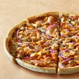 We start with our Original Thin Crust and smother it with a zesty Bar-B-Que sauce and mozzarella cheese. Then we add diced chicken, onions and more mozzarella cheese.