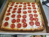 Classic cheese or create your own pizza. Tall and doughy, focaccia style. Perfect for family gatherings. Square cuts. Our dough and tomato sauce are fat free and sugar free.