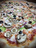 Tomato sauce, mozzarella cheese, sausage, pepperoni, red onions, green peppers and black olives. Our pizza dough and tomato sauce are fat free and sugar free