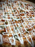 Tomato sauce, mozzarella cheese, jalapenos, buffalo chicken. Topped with ranch out of the oven.