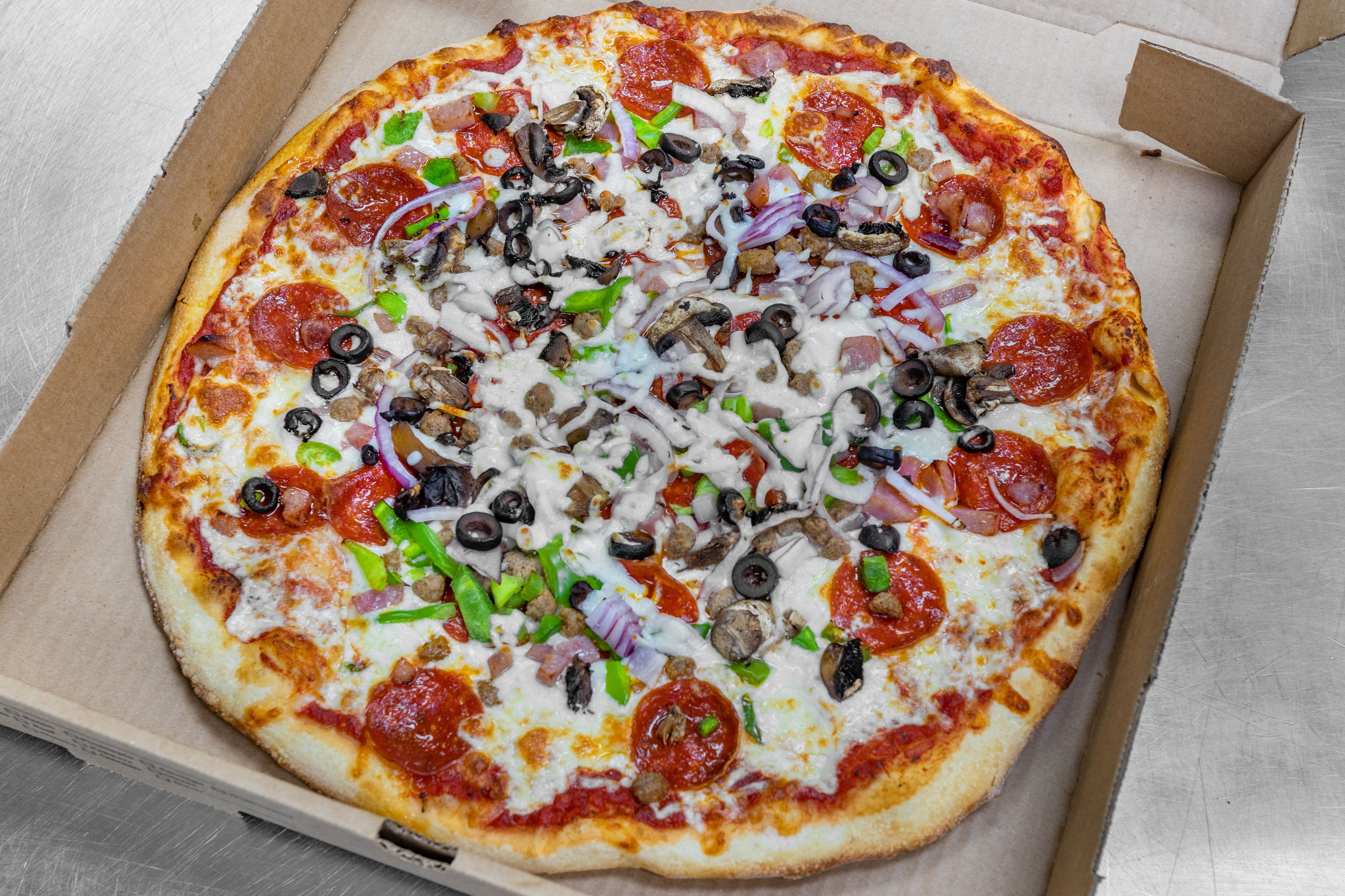 Pepperoni, sausage, ham, ground beef, onions, green peppers, mushrooms, olives.