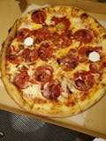 Pepperoni, sausage, meatball, onion, peppers, mushroom, bacon and mozzarella.