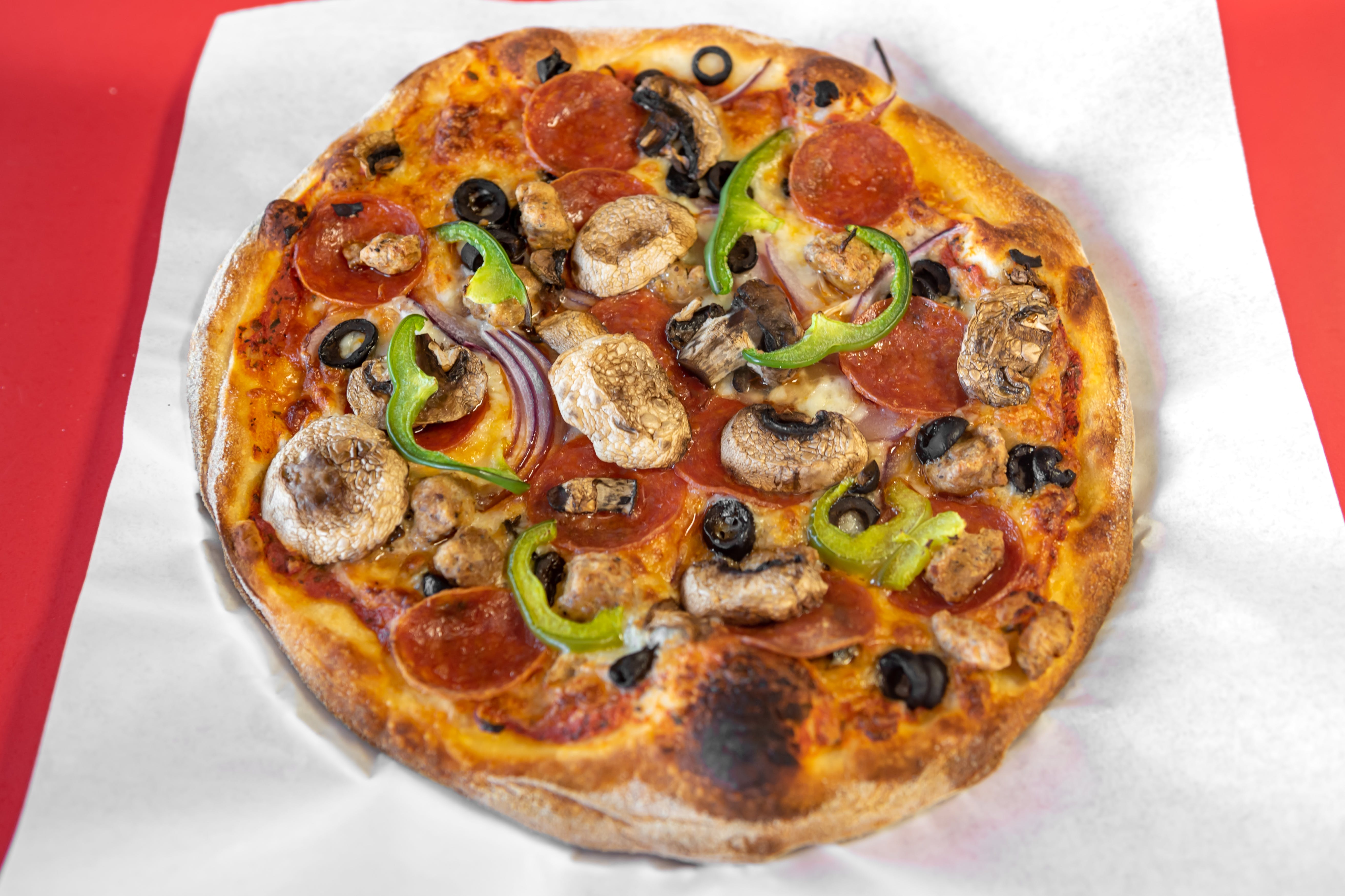 Pepperoni, ham, sausage, mushrooms, bell peppers, onions, olives.