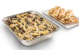 Penne Rigati, All-Natural Grilled Chicken, Mushrooms, Black Olives, Mozzarella Cheese, all tossed in our Creamy Pesto Sauce, and served with a regular cheezee garlic bread. Serves about 10.