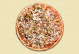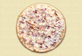 White sauce base. Pizza sauce, mozzarella cheese, crispy chicken, green peppers, onions, roasted red peppers, garlic & olive oil.