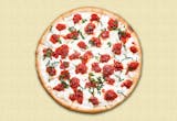Tomato sauce base. Mozzarella cheese, crispy chicken, marinara sauce, roasted red peppers, fresh mozzarella cheese, fresh basil & garlic oil.