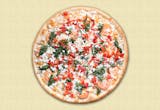 White sauce base. Mozzarella cheese, spinach, tomatoes, roasted red peppers, feta cheese, garlic & olive oil.