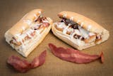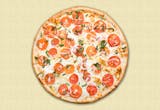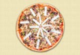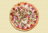 Tomato sauce base. Pizza sauce, mozzarella cheese, pepperoni, sausage, meatballs & bacon.
