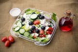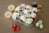 Romaine lettuce, tomatoes, green pepper, onions, mozzarella, cucumbers and with the option of croutons.