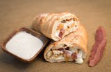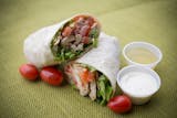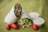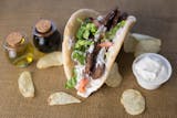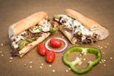 White sauce base. Homemade beef gyro, chopped tomato, onion, green peppers, roasted red peppers, and mozzarella cheese.