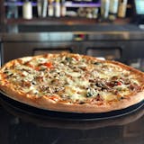 Pepperoni, sausage, mushrooms, onions, peppers, and broccoli.