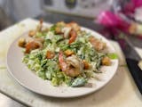 Delicious pizza crust topped with grilled chicken and Caesar salad