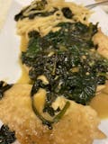 Salmon topped with spinach sautéed in oil, garlic and marsala wine sauce served on a bed of linguini pasta.