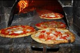 Tomato basil sauce topped with a combination of sauteed fresh spinach, broccoli, mushrooms, flame roasted peppers and fresh mozzarella.