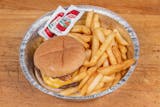 6 oz 100 % beef burger on a Brioche bun topped with lettuce, tomato, pickles, onions ,ketchup and mayonnaise.Served with french fries.