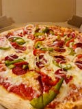 Thin Crispy Sicilian Pizza With fresh mozzarella, meatballs, beef pepperoni, ricotta cheese, jalapenos, basil, oil, tomato sauce and parmesan cheese.