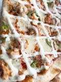 Chicken, buffalo sauce, mozzarella topped with crumbled bleu cheese and sliced jalapeños drizzled with ranch dressing.