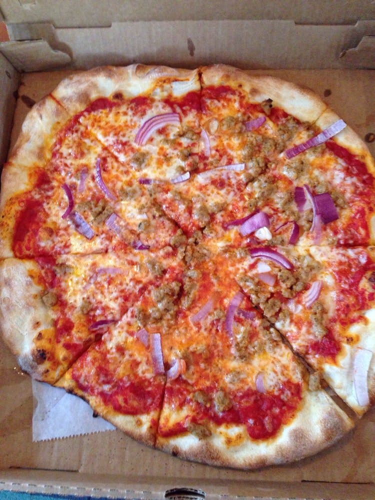 Tomato, red onions, mushrooms, black olives, green peppers, and broccoli.