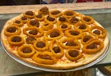 Our thickest (circular) dough covered with extra sauce and cheese, topped with peppers, onions, and mushrooms.