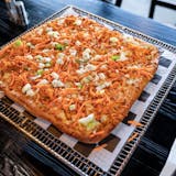 White sauce, buffalo chicken, gorgonzola cheese, shredded mozzarella, carrots, celery.