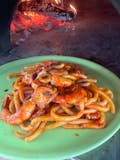 Thick spaghetti with Guanciale onion Pecorino cheese and tomato sauce.