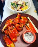 Crispy to perfection Buffalo sauce chicken wings served with celery stick and blue cheese sauce.