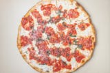 Fresh mozzarella cheese, fresh basil, and homemade tomato sauce.